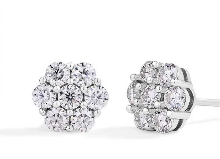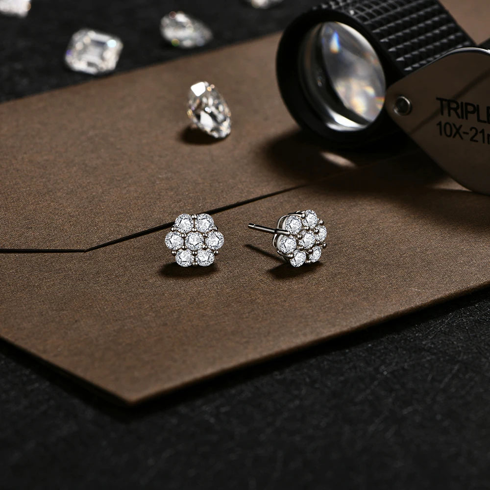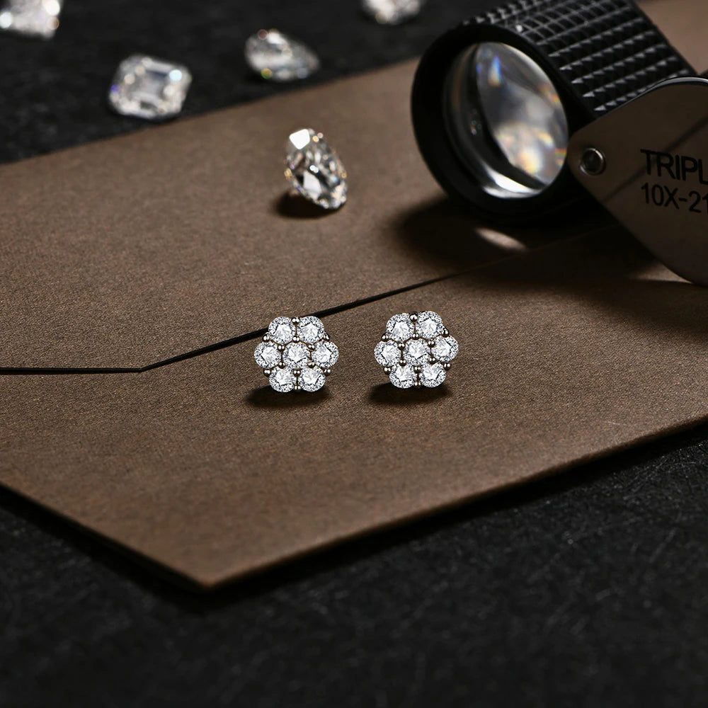 Die Blossom Ohrringe bestehen aus 925 Sterling Silber und sind mosaikartig mit mehreren D-Color VVS1 Moissanite-Steinen besetzt. Die Steine haben Größen von 2,5 mm und bilden gemeinsam ein präzises Blütenmuster mit gleichmäßiger Brillanz.